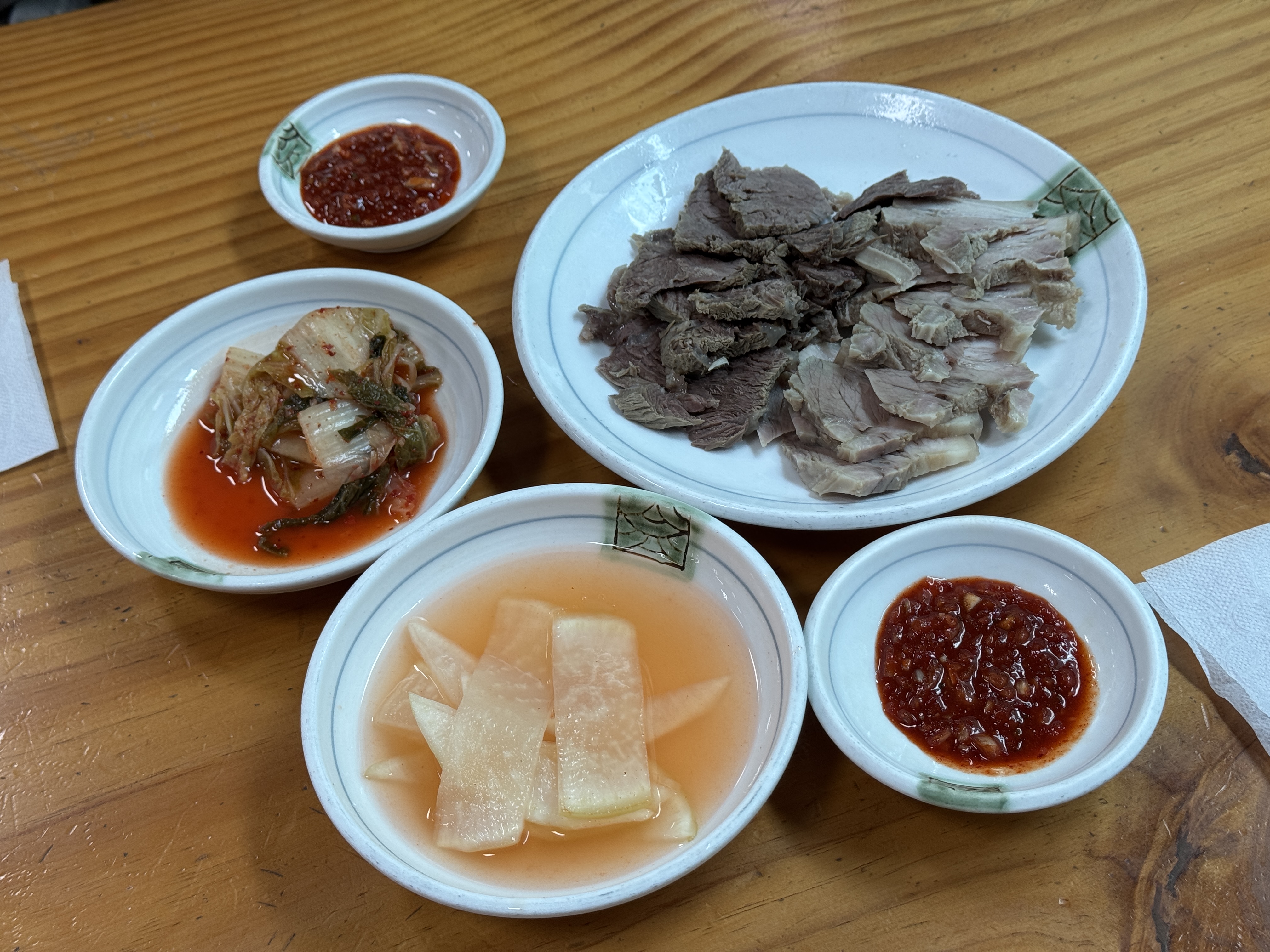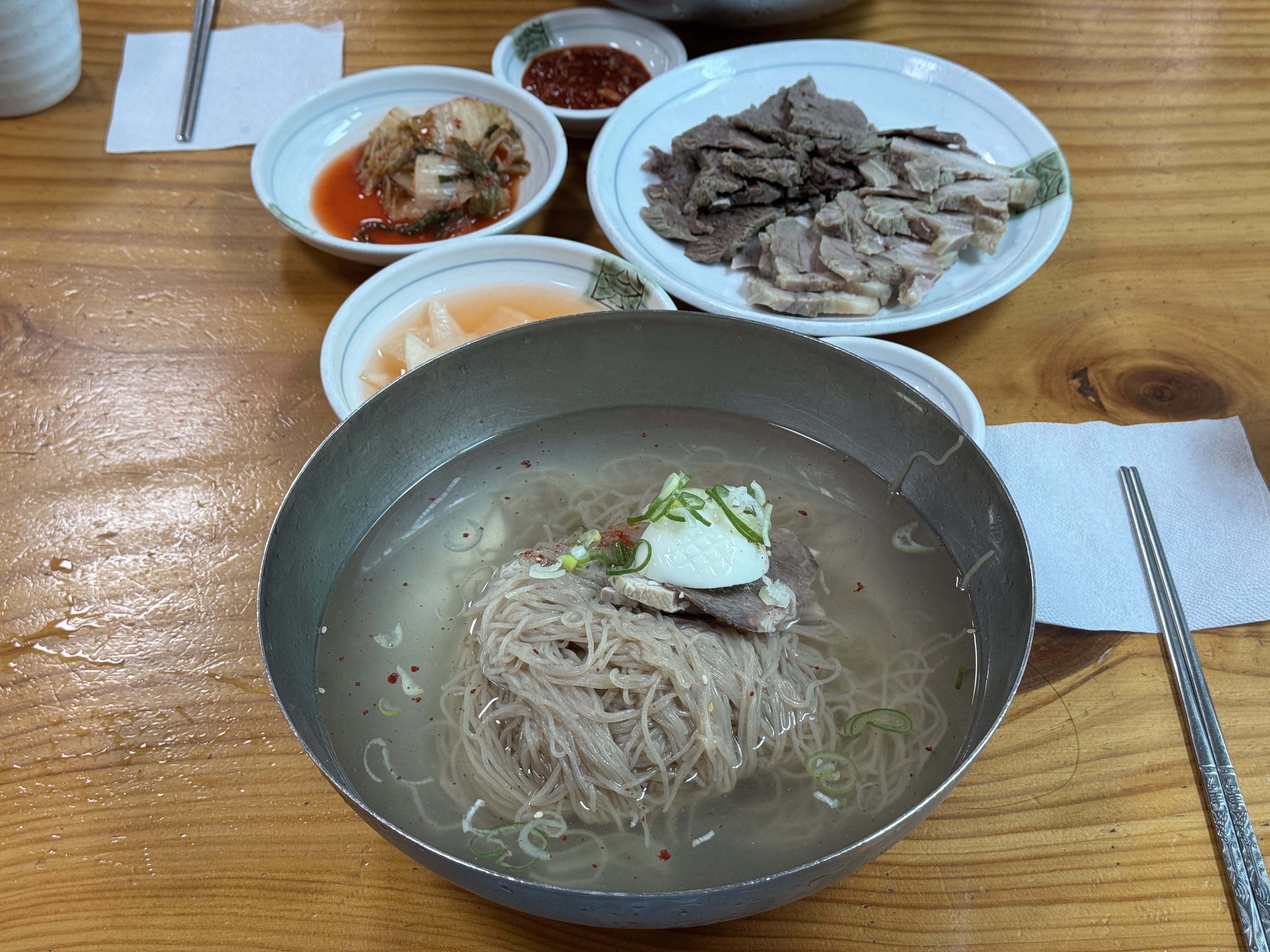 테이블엔 젓가락, 겨자, 식초, 고춧가루, 간장, 냅킨이 구비되어 있어요.
