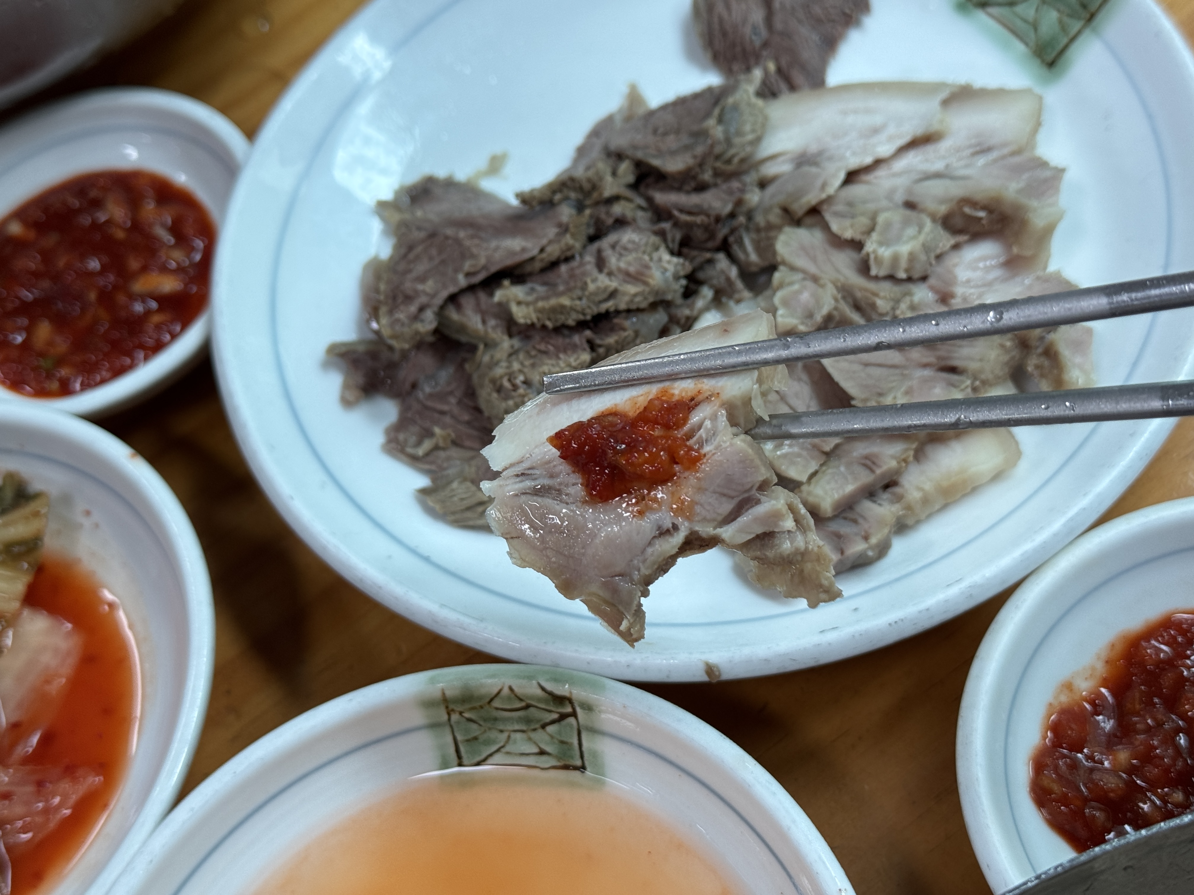 돼지고기 수육은 그냥 단독으로 앞에 보이는 빨간 소스를 찍어먹는 게 제일 맛있고