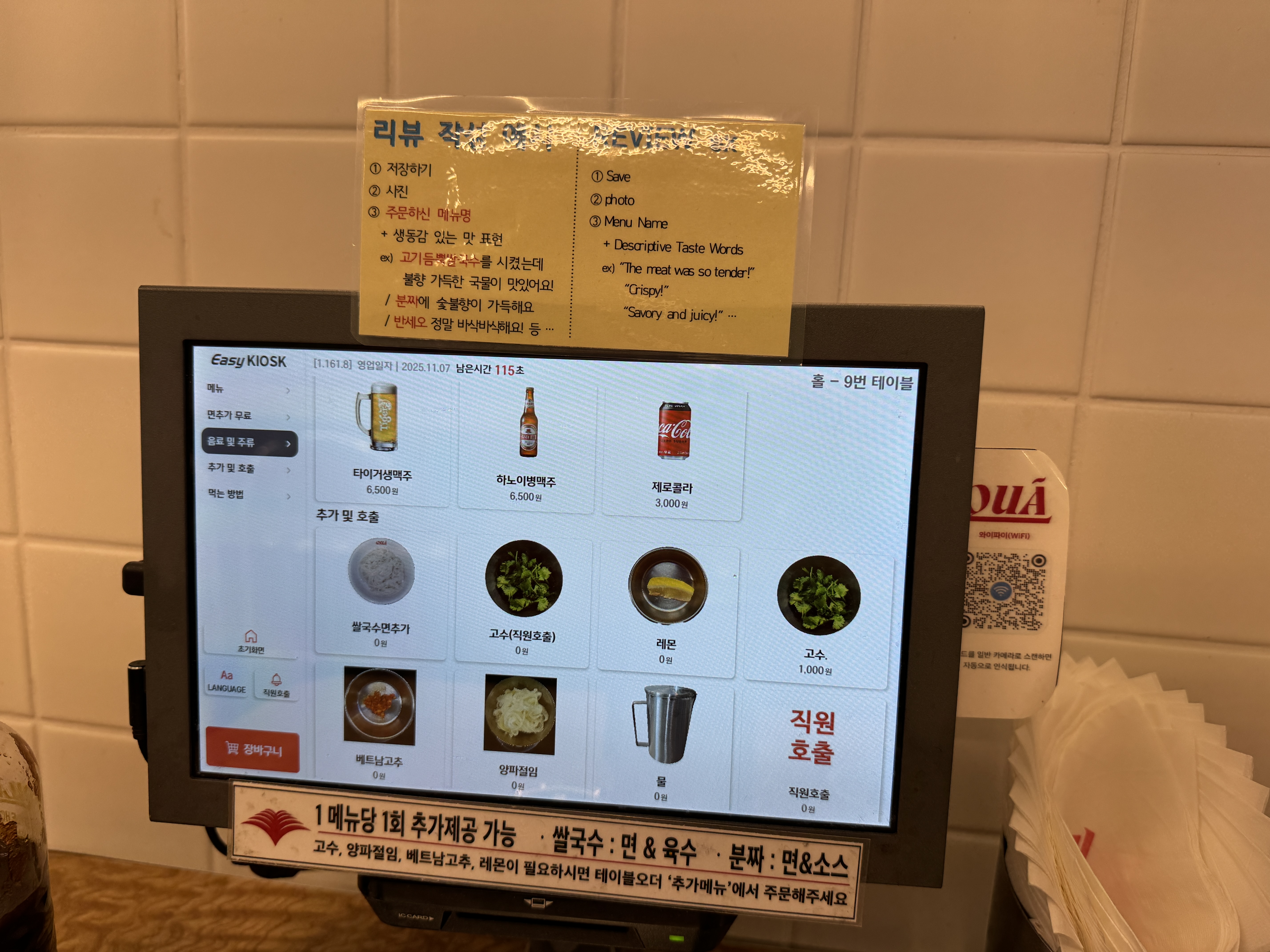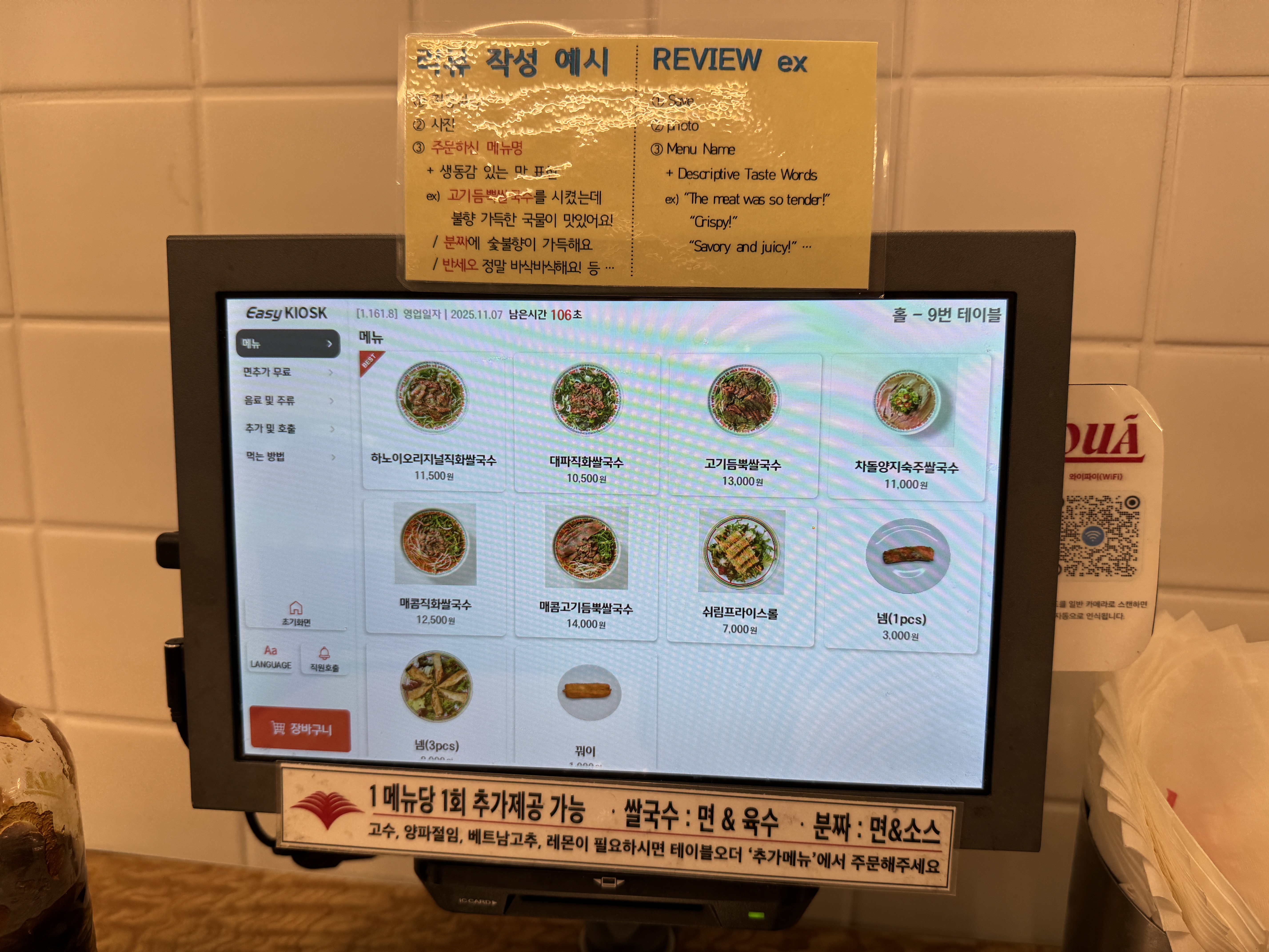 아래쪽에 보이듯이 1 메뉴당 쌀국수 면&육수 1회 추가 제공이 가능해요.